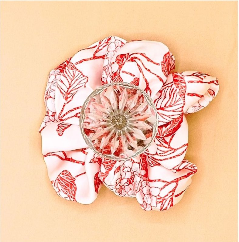 Pensé pour sublimer vos coiffures avec élégance, ce chouchou en soie imprimée séduit par son allure raffinée et intemporelle. Son imprimé floral rouge et ivoire, inspiré de fleurs délicates aux lignes graphiques, apporte une touche lumineuse et sophistiquée à votre look. Les pétales dessinés avec finesse créent un contraste harmonieux et mettent en valeur la soie, faisant de cet accessoire un véritable détail de style, chic et féminin.