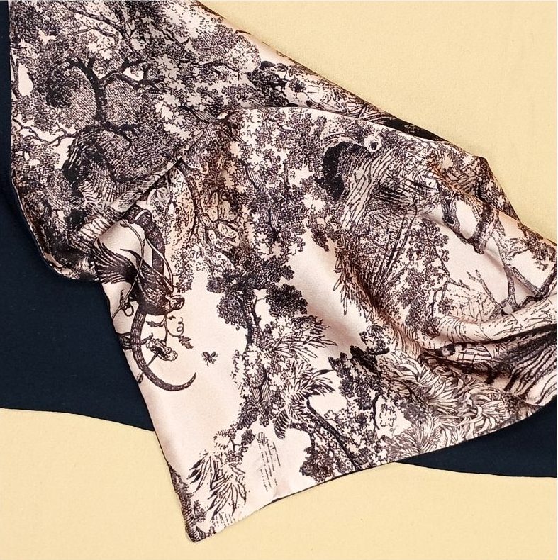 Be the first to review “Etole 100% soie imprimée Jungle Rose doublée bleu marine”